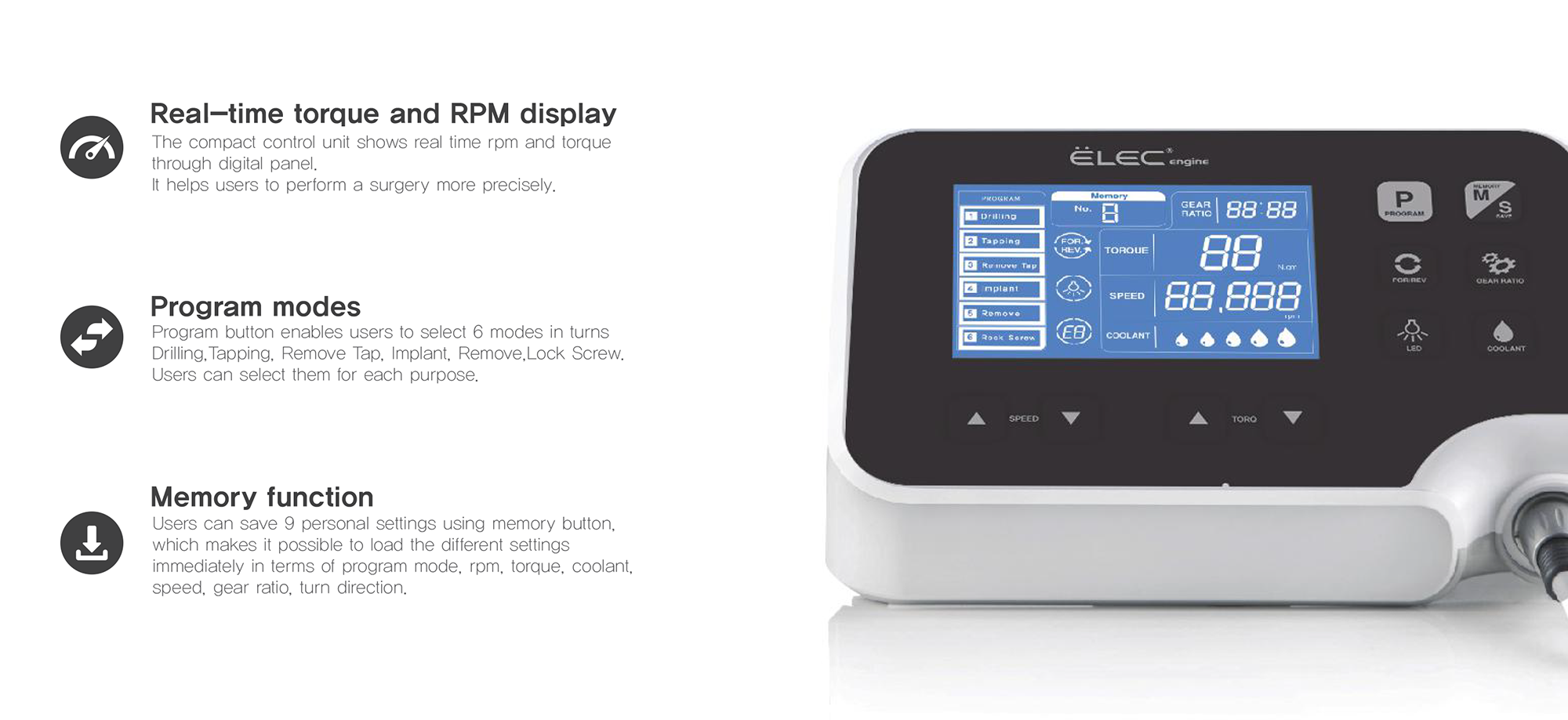 The ISE-270 is designed to make the implant process as streamlined as possible to work with the busy shifts and packed schedules of many dental clinics. The ISE-27 motor is made with a modern, streamlined design for optimum ease of use so that clinicians can spend less time fumbling with equipment and more time providing patient care. Enhanced precision and visibility are achieved using the following features: